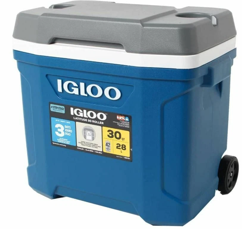 Ideal for BBQ's, fishing, boats, beach days, sporting events, caravans and motorhomes to keep your food and drink cool. With 28 litres capacity and vibrant blue, the Igloo Latitude 30 QT Roller Cool Box is both stylish and practical. The Latitude 30 Roller can hold up to 42x 330ml cans and includes Igloo ice retention for up to 3 days. The Latitude 30 from Igloo also includes moulded handles with cup holders for easy transportation when carrying from your vehicle etc. The locking telescopic handle feature means that the handle can be extended to the correct height if needed. -28 litre capacity. - Two drink holders on lid Locking telescoping pull handle Wheels for maximum mobility Moulded carry handles. Dimensions: External: L x 46 W x 34 H x 44 cm. Weight: 3.2 kg REQUIRES ICE PACKS