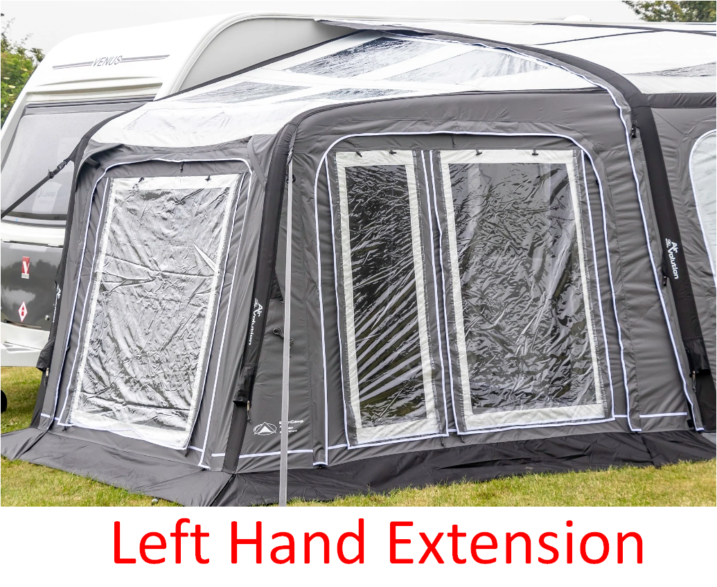 Expand your outdoor living space with our Inceptor ApartAIR Extension, perfectly designed to integrate with your Inceptor AIR Extreme 330 or 390. Manufactured in our 300D PRO-TEK fabric, this extension not only matches your existing awning but also enhances your camping experience. Setup is hassle-free; simply zip it onto the side of your awning, choose from left or right options (note: not interchangeable) and inflate using the pump that comes with your awning, then peg it out. The extension features large, expansive windows on both the front and side panels, allowing ample natural light to brighten your space while adding a touch of elegance to your campsite. Features: 300D PRO-TEK fabric Flame Retardant 6000mm Hydrostatic Head SunnCamps enhanced roof profile (ERP) Window lights in roof (with curtains) Curtains on all windows/Multi-zip curtains on front windows External peggable mud wall for extra weather protection (PVC mesh) Approx. pack size: 72 x 28cm Approx. weight: 12kg Optional Extras: Luxury carpet Breathable Groundsheet